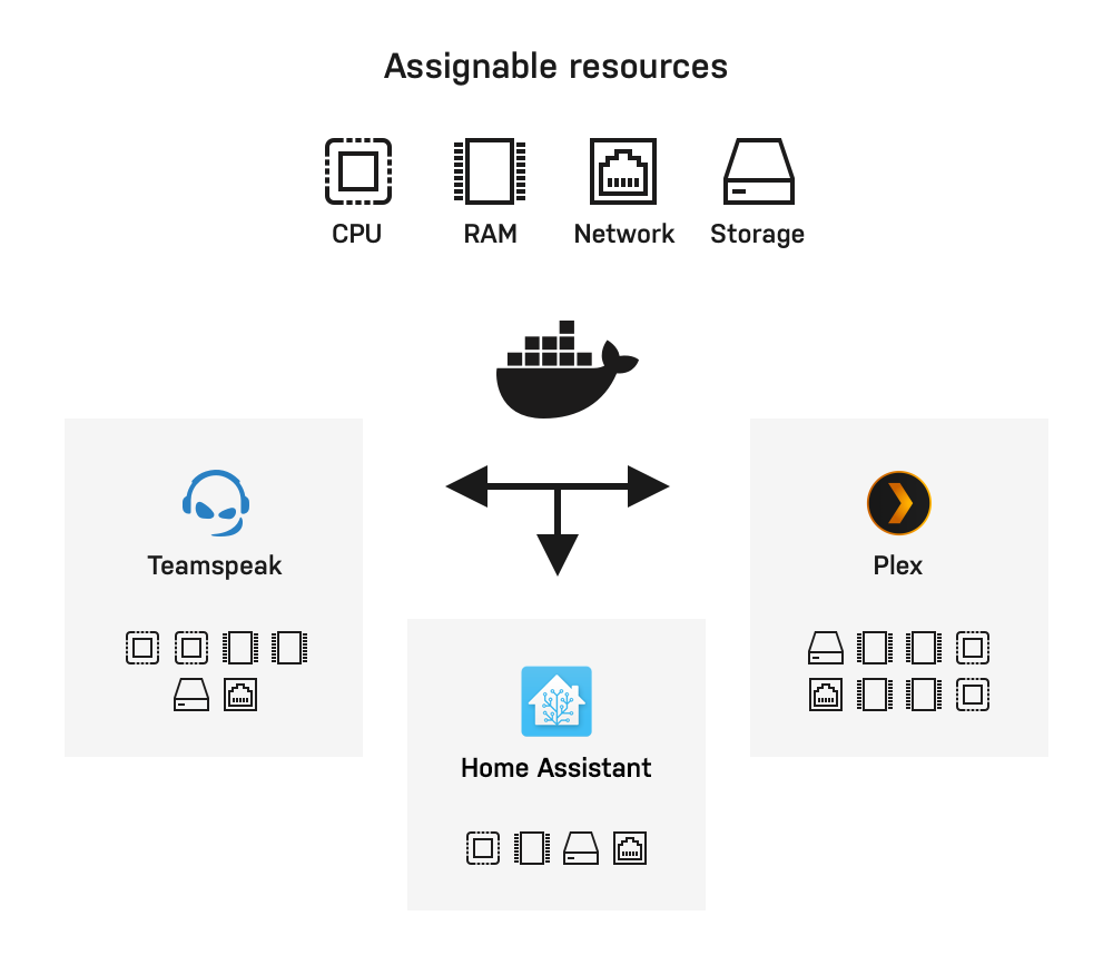 Docker works by allowing applications access to the system resources of the host operating system, such as CPU, memory, disk, and network, but isolates them into their own run-time environments. Unlike virtual machines, containers do not require hardware emulation, which eliminates overhead, hardware requirements, and provides near bare-metal performance.