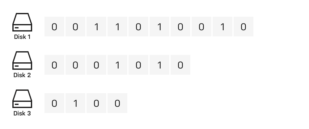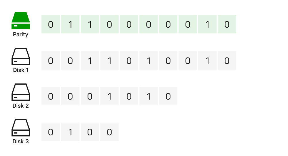 In the picture above, we have three drives and each has a stream of bits that vary in count based on the device size. By themselves, these devices are unprotected and should any of them fail, data will be lost. To protect ourselves from failure, we must add a fourth disk to serve as parity. The parity disk must be of equal or greater size than the largest data disk. To calculate the value of each bit on the parity disk, we only need to know the sum total for each column. If the sum of a column is an even number, the parity bit should be a 0. If the sum of a column is an odd number, the parity bit should be a 1. Here's the same image as before, but with parity calculated per frame:
