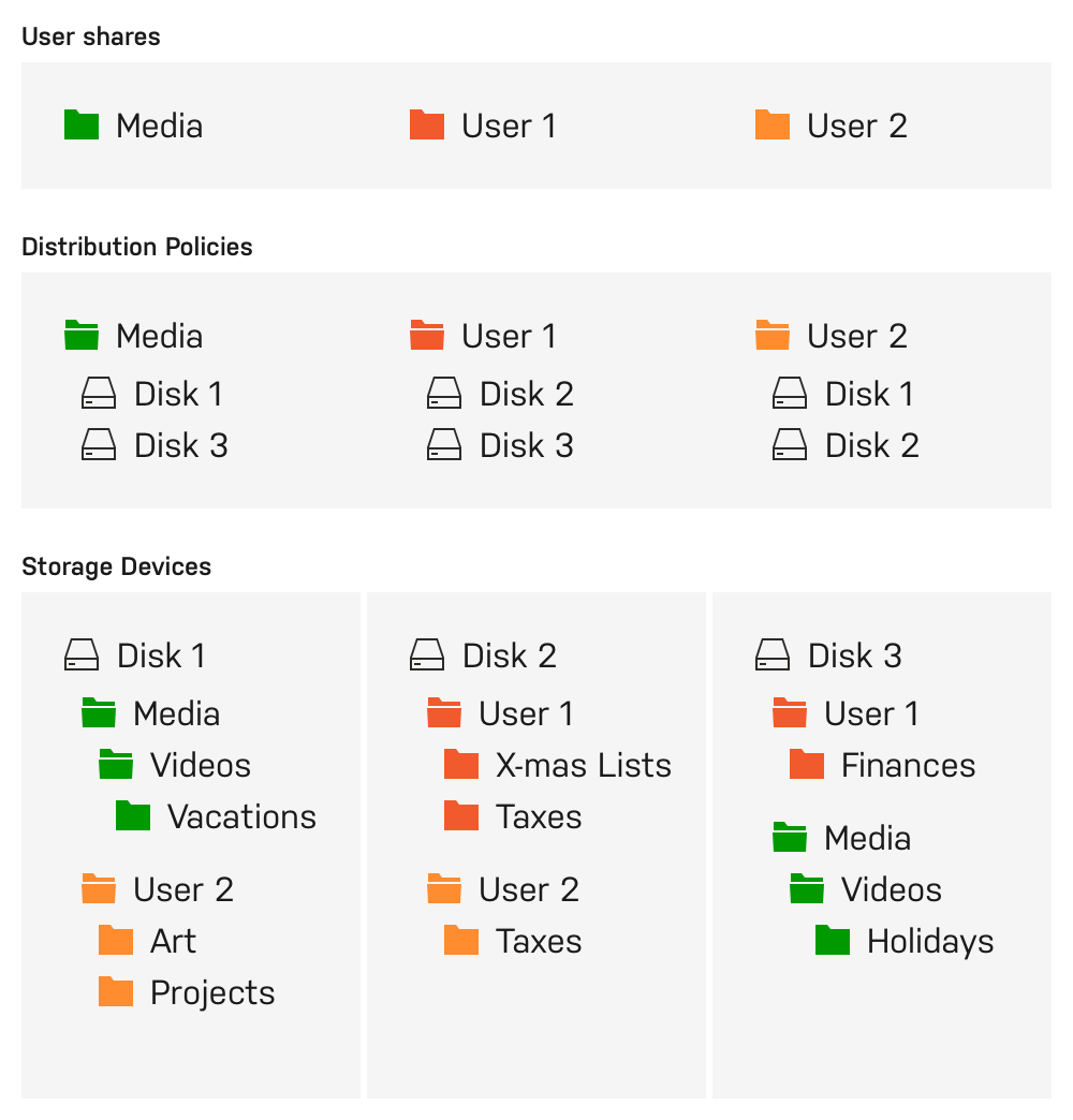 Unlike most RAID systems, Unraid saves data to individual drives. To simplify manageability, the root user can create shares that allow files written to them to be spread across multiple drives. Each share can be thought of as a top-level folder on a drive. When browsing through a share, all data from all drives that participate in that share will be displayed together. Users do not need to know which disk a file is on in order to access it under a share. Shares can be tuned to include/exclude specific disks and to use various methods for determining how files are allocated across those disks. In addition to controlling how data is distributed across drives, you can also control what network protocols the share is visible through as well as define user-level security policy. When accessing your Unraid server over a network protocol, all shares exported through that protocol will be visible, but you can toggle protocols for both individual shares as well as at a global setting level. Should you have private data on your system that you wish to protect from anonymous access, user accounts can be created and policies defined to limit access to only trusted individuals.